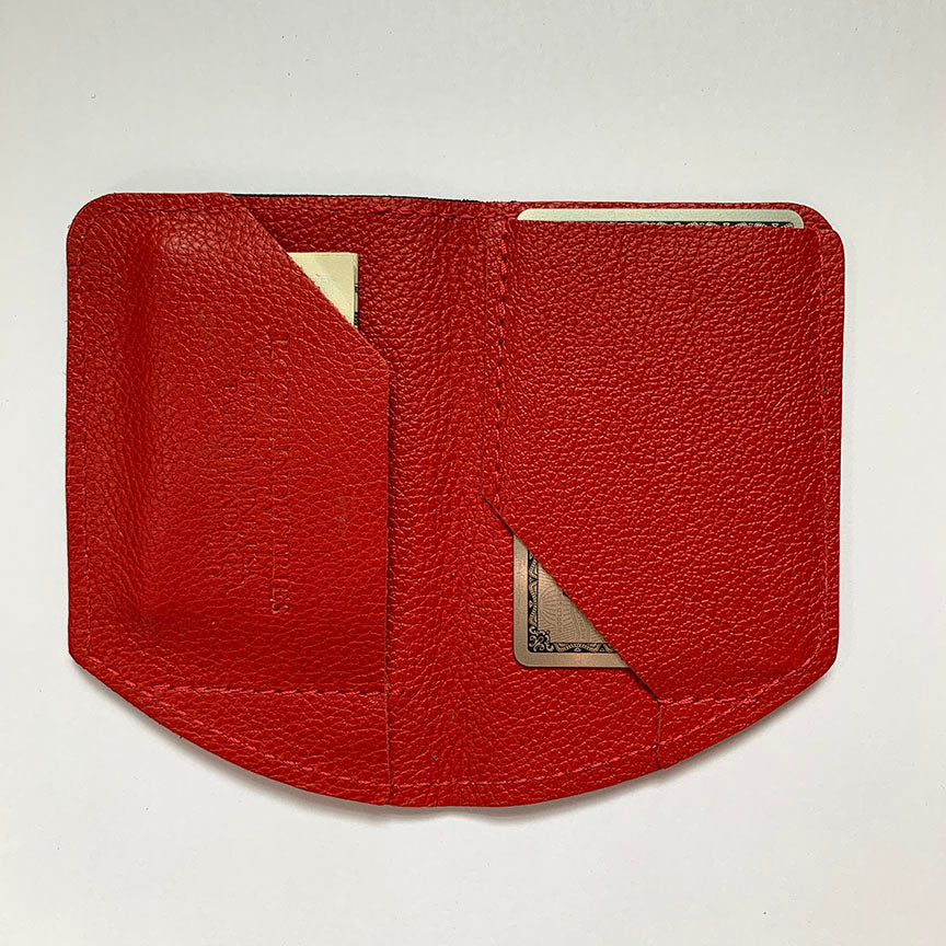 One for the ladies. Truly minimalist design. Space for currency and three cards, or no paper money and six cards. Stitched with care in Maine, at our own solar-powered workshop.